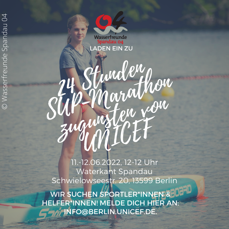 Rund um Eiswerder auf der Spandauer Havel werden Paddler*innen auf Stand-Up-Paddle-Boards und in anderen Kanus ihre körperliche Leistungsfähigkeit in den Dienst der guten Sache stellen und Spenden für UNICEF erpaddeln. Dabei kann man von einer Stunde bis 24 Stunden am Start sein, im Team, allein, als Staffel oder in jeder erdenklichen anderen Gruppenform. Jede*r ist herzlich eingeladen mitzumachen: Kids, Jugendliche, Best Ager, Freizeitsportler*innen und Leistungssportler*innen. Sogar andere sportliche Aktivitäten können mit eingebracht werden. Hauptsache man ist dabei!